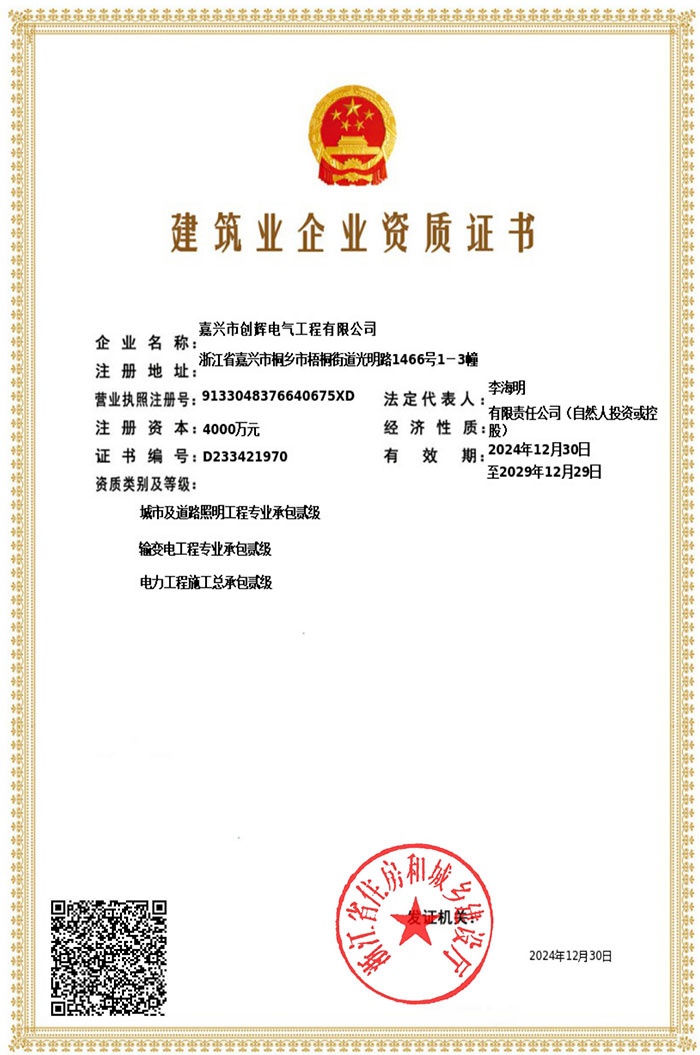 嘉興市創(chuàng)輝電氣工程有限公司,總部坐落于浙江桐鄉(xiāng)經(jīng)濟(jì)開發(fā)區(qū),公司成立于2004年,是一家承接高、低壓輸變電工程施工安裝、維修的企業(yè)。公司下設(shè)人事行政部、預(yù)結(jié)算部、采購(gòu)部、財(cái)務(wù)部、營(yíng)銷部和工程部等,其中工程部根據(jù)具體作業(yè)內(nèi)容分設(shè):變電項(xiàng)目部(12個(gè)班組)、線路項(xiàng)目部(6個(gè)班組)?,F(xiàn)有員工500余人,其中擁有一級(jí)建造師3名,二級(jí)建造師15名,高級(jí)工程師1名,工程師36名,助理工程師52名,高壓電工240余名。目前我公司已具備電力工程總承包貳級(jí)資質(zhì),輸變電工程專業(yè)承包貳級(jí)資質(zhì),城市及道路照明工程專業(yè)承包貳級(jí)資質(zhì),承裝(修、試)電力設(shè)施許可二級(jí)資質(zhì),建筑施工安全生產(chǎn)許可,是浙江省高新技術(shù)企業(yè)、省AAA級(jí)“守合同重信用”企業(yè)。